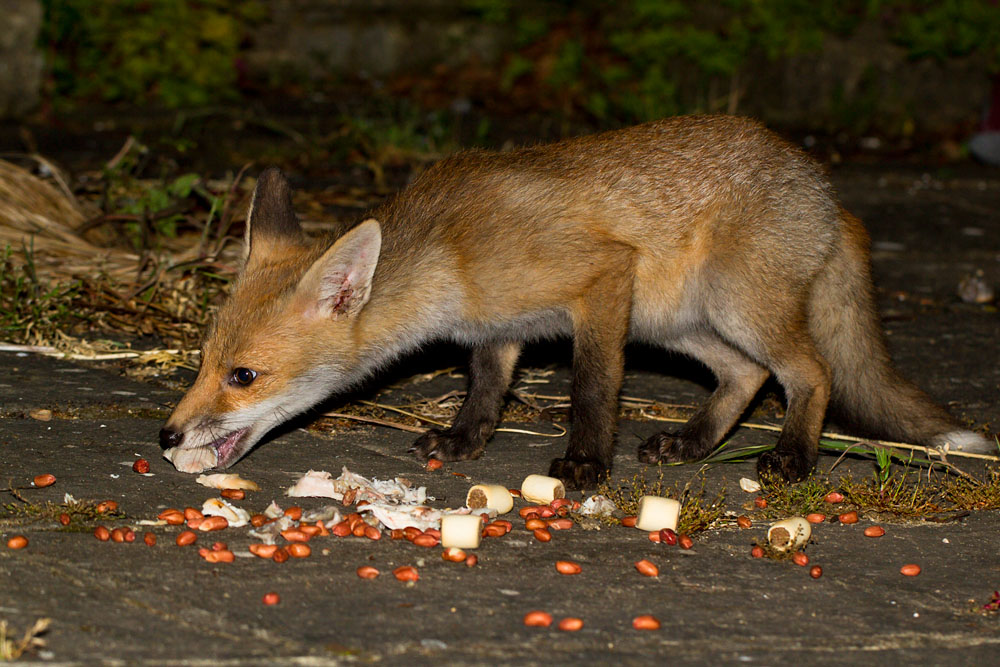 | 0204130306121066 | Fox cub (Vulpes vulpes) stretching forward to eat dog treats and peanuts in a suburban garden. | ||||||||||||