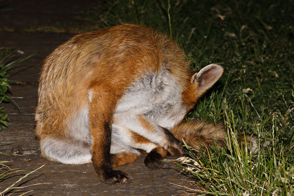 | 0403132505080241 | Fox (Vulpes vulpes) grooming itself on a garden path. | ||||||||||||