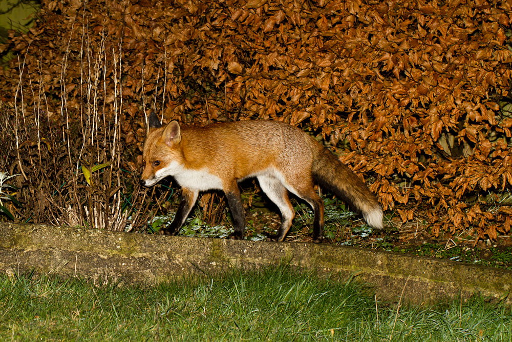 | 0412122911126366 | Fox (Vulpes vulpes) against a copper beech hedge in a suburban garden. | ||||||||||||