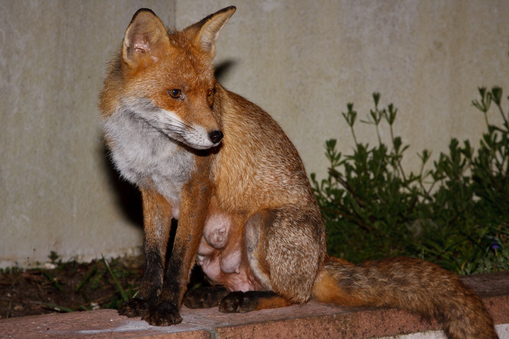 | 0902132004104499 | Lactating female fox (Vulpes vulpes, vixen) sitting on a wall about a month after giving birth to a litter of fox cubs. | ||||||||||||