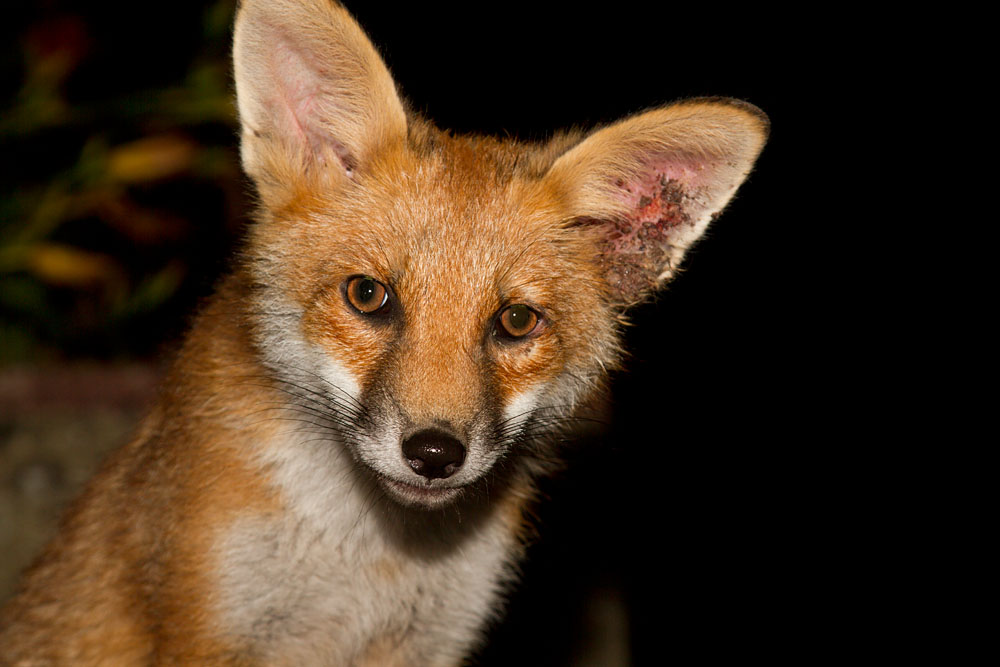 | 1404132906127063 | Fox cub (Vulpes vulpes) portrait with injured ear sitting in the corner of a garden. | ||||||||||||