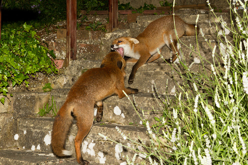 | 1504133006127287 | Fox cubs (Vulpes vulpes) playing on stone steps in a suburban garden. | ||||||||||||