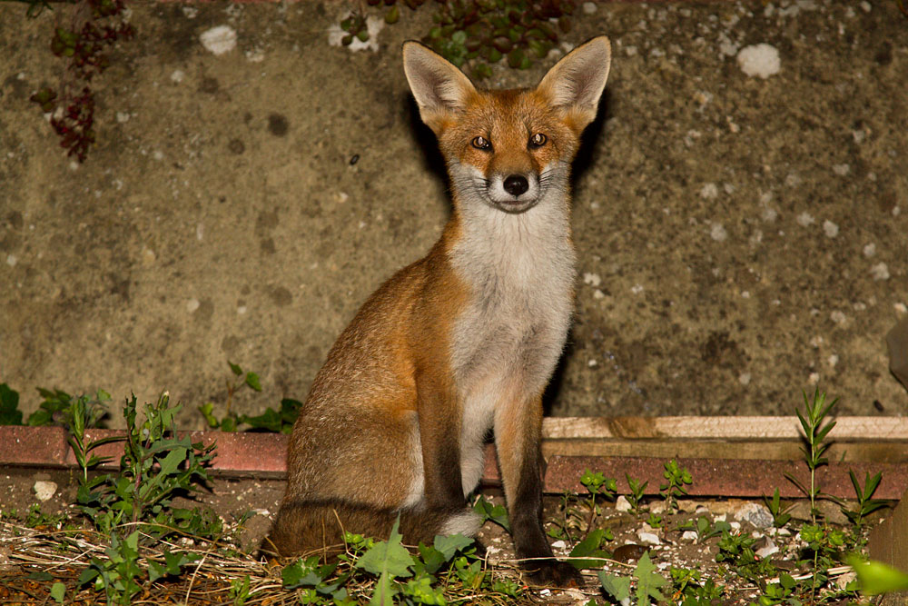 | 1812120107127517 | Young urban fox (Vulpes vulpes) sitting among weeds in front of a stone wall. | ||||||||||||