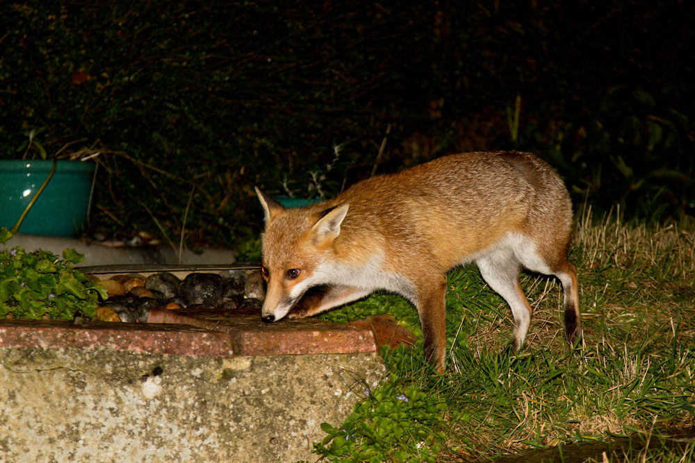 | 2310121710129999 | young female urban fox (Vulpes vulpes) standing on a low wall in a garden in East Sussex at night. | ||||||||||||