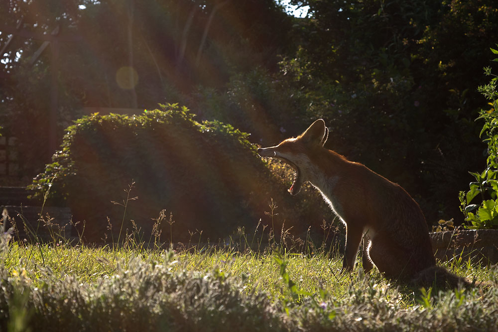 | 2601131306075742 | Yawning fox (Vulpes vulpes) backlit by strong sun in a suburban garden | ||||||||||||