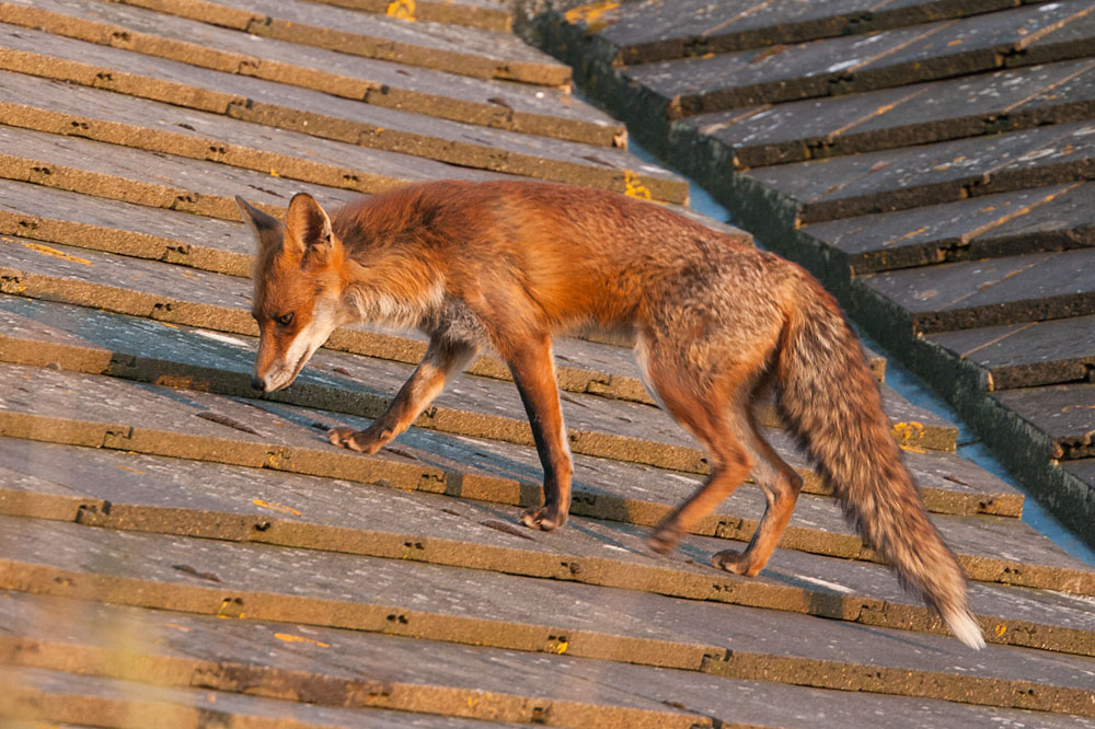 | 2801131004078956 | Fox (Vulpes vulpes) climbing to the top of the roof of a house. | ||||||||||||