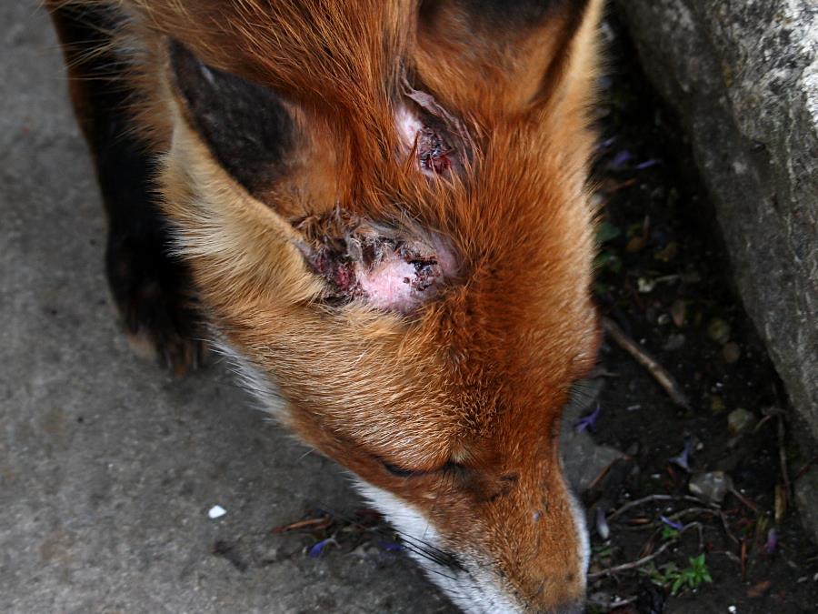 | Wounded fox, 31/5/07 This shot shows the two extensive head wounds he suffered. Fortunately they were clean and healed extremely well without any intervention. |
