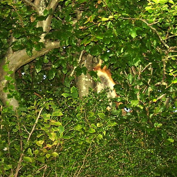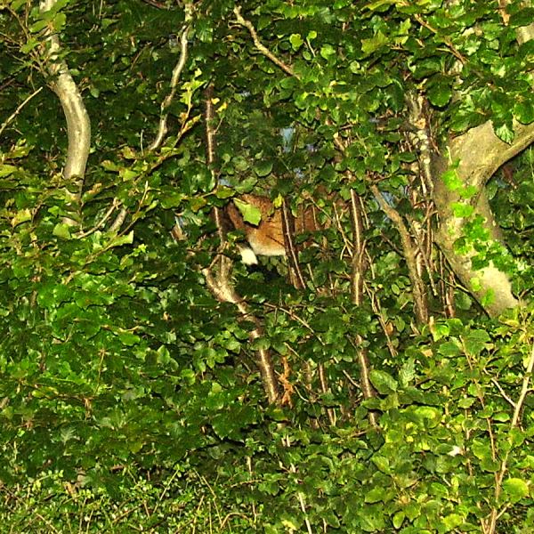 Probably my favourite shot. The fox is clearly visible looking out of the trees. It had already descended once, and then re-climbed from the other side. (20.30)