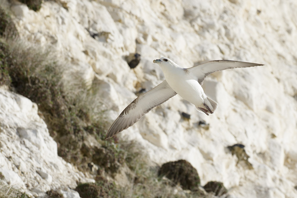 Fulmars spend a lot of time sweeping along the cliffs looking for landing sites.