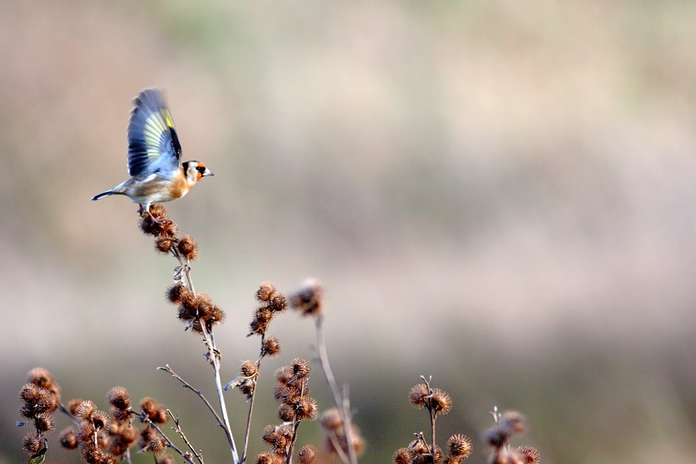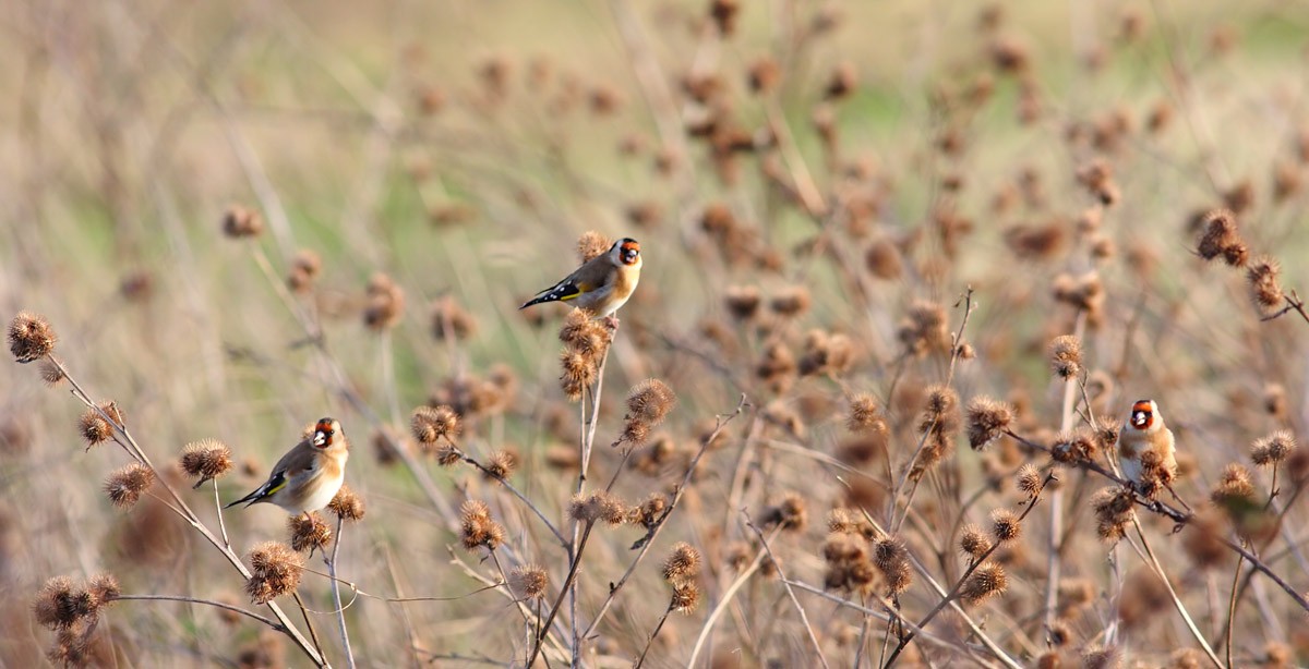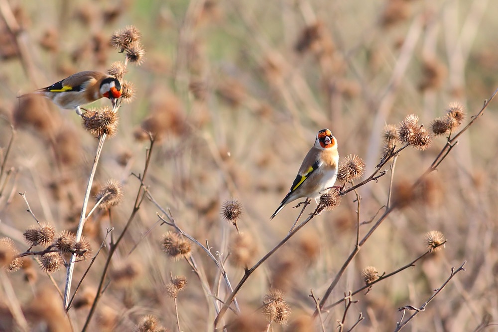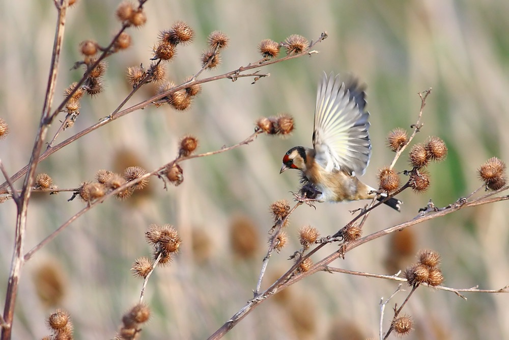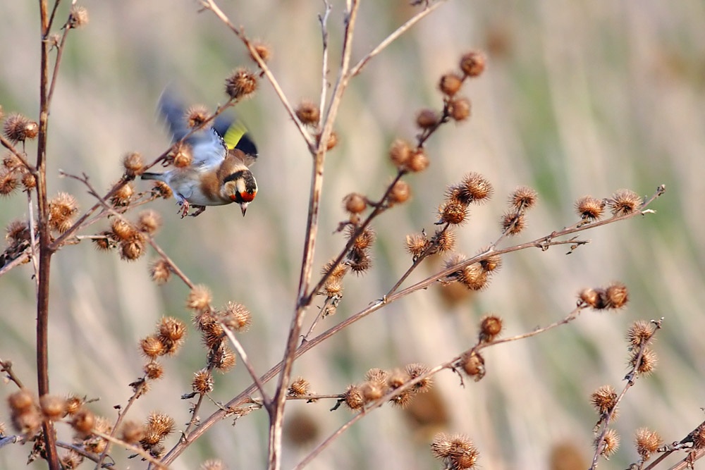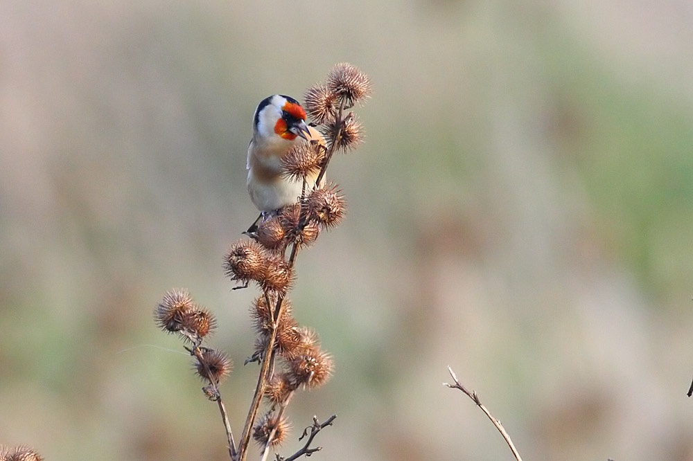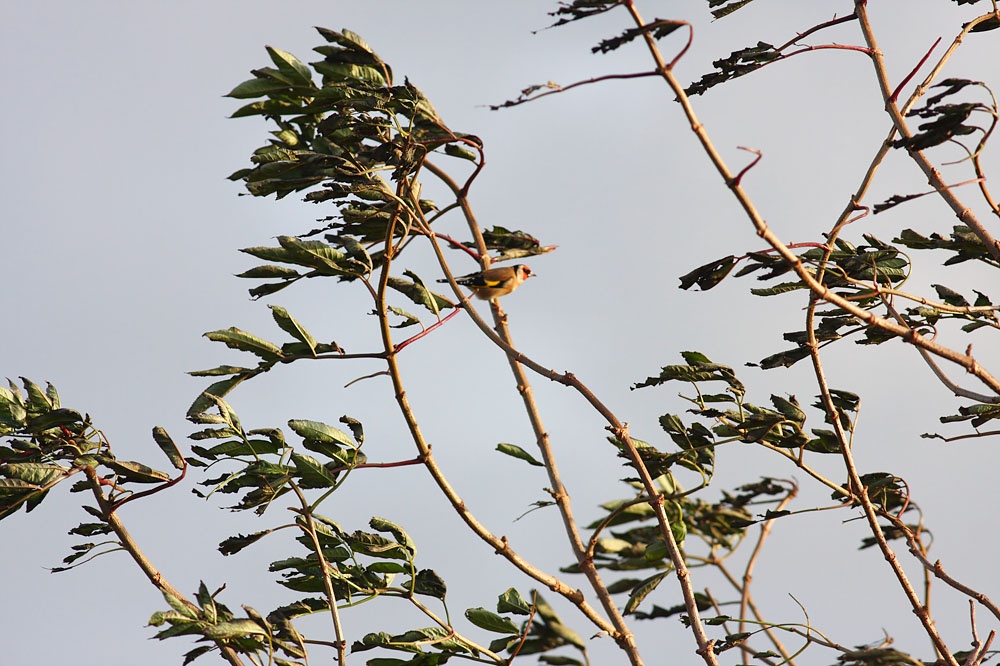 And I saw gold. Or to be precise goldfinches. A small flock was busy feeding on seed heads, dashing between the low trees that punctuate this part of the South Downs. They were more often than not hidden by the branches (now largely clear of leaves), but once in a while they would perch on the higher branches or move into less crowded areas to feed.