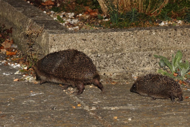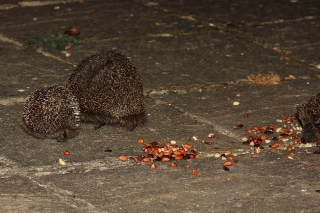 I'll start with the hedgehogs, with a shot taken in the early hours of Friday morning. It's not the best shot I've taken, but it's the first with three hogs in the same shot (just). It seems that somewhere over the summer we have acquired a new youngster. Hedgehog family