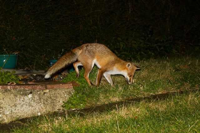 He hung around for a while, before skulking off (no treats tonight). I thought he'd had a change of mind when a similar sized fox appeared from the side of the garden. It wasn't him though. If my identification is correct she's the little vixen from earlier in the year. She was certainly not disturbed by the camera and happily explored while we watched.