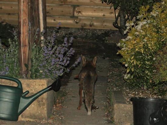 Monday night was interesting. The fox only appeared briefly, and I only managed one (bad) photo of him. It was late, and I'd just popped outside. I didn't hear him arrive, but I spotted him coming up the path with something very large, and somewhat red, in his mouth. And it wasn't a bonio biscuit. By the time I'd even begun to figure out the camera (long lens, only moonlight and a torch to focus by) he'd calmly walked past and was disappearing out of the rear of the garden. I'm fairly certain that what he was carrying was a rather large rabbit! He's evidently a capable hunter when he's not dozing on roof tops.