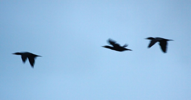 And as the light fades away, three cormorants head out to sea