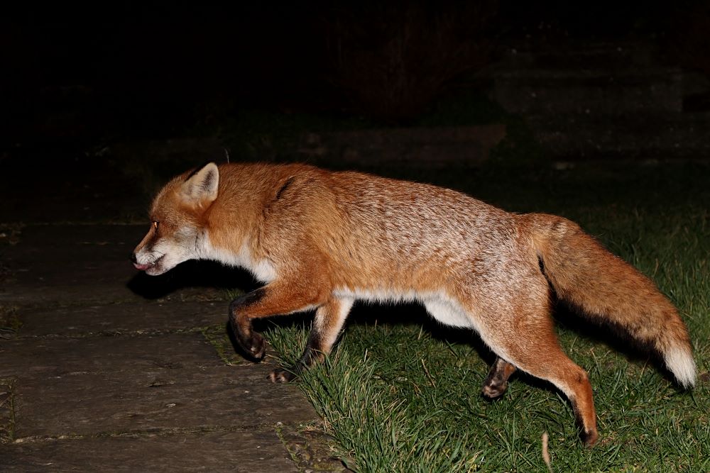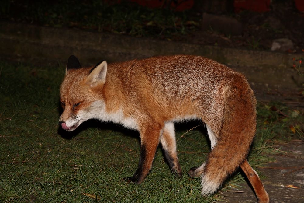 On Saturday, the old dog fox showed up late in the afternoon. He seems to be carrying a limp (again!) on his left rear leg. I doubt it's serious as he was quite comfortable putting weight on it when he was standing. Most likely a strain. Certainly there were no other signs of injury as he prowled the garden for several minutes