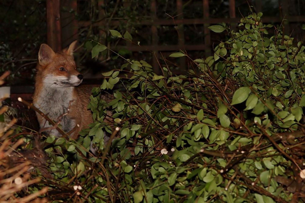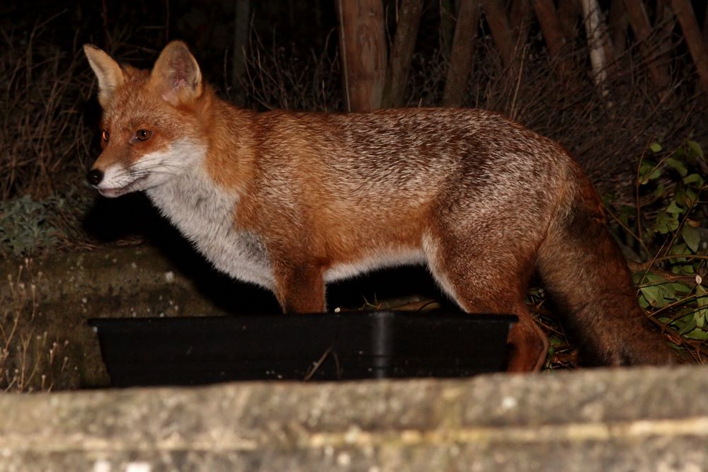 While I was out with the mouse, a fox came over the fence at the rear of the garden. I caught a glimpse as it shot along the rear of the garden, and was delighted when it returned a couple of minutes later. I was even more surprised to see that it was the 'third' fox of the January trio. After tonight's visit it's going to be difficult to maintain the pretence that this one's shy. The visit lasted about 7 minutes.