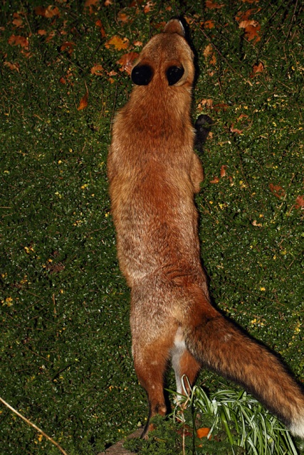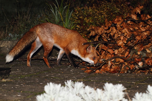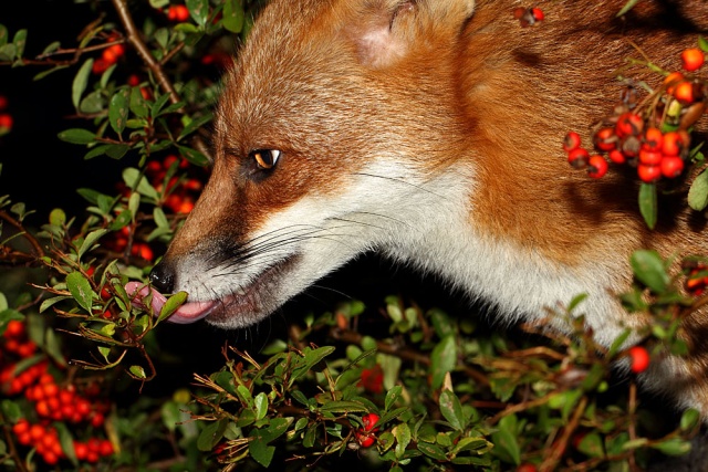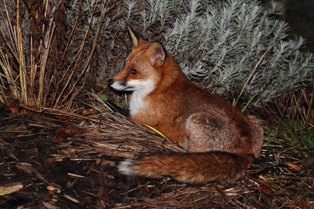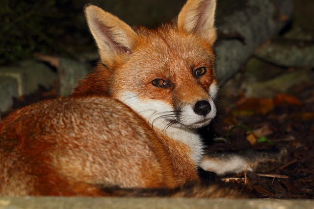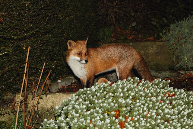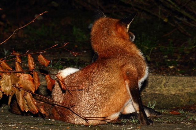 I hadn't picked up the camera at all today until about 11pm at night. That's leaving it late to get a daily photo, but I needn't have worried. Shutterbug the fox decided that today was going to be one of those days when he lolls around the garden happy for some company. He was out there for about half an hour, dozing, investigating, clambering up the hedge, nosing in the wood pile and generally being a very contented fox.
