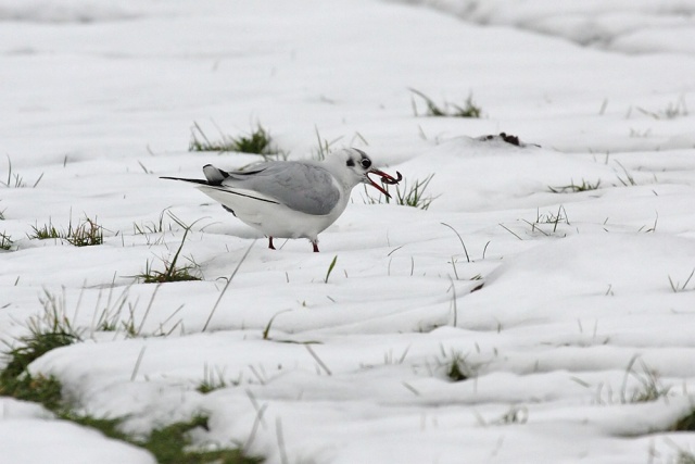 I was out in the fields near work yesterday. There were fieldfares and redwings hugging the tree line, and a small flock of black-headed gulls searching for worms in the fast-melting snow. Black-headed gull with worm