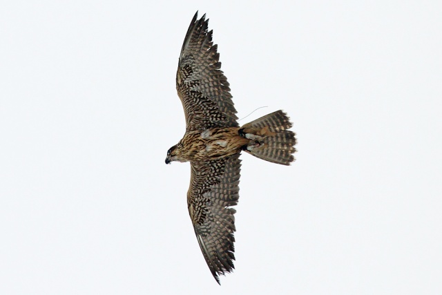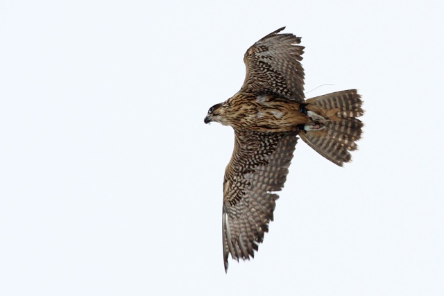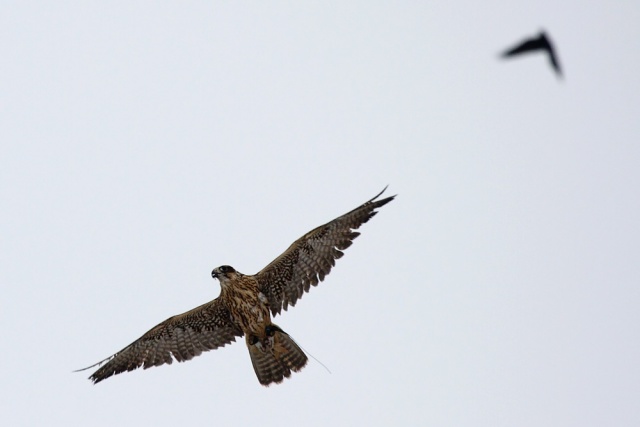 Other than the gulls it was relatively quiet, until a flock of rooks raced into view, followed by a flock of smaller birds which wheeled off to the right. Something had caused them to behave like this and sure enough a large raptor came into view. It wasn't a kestrel or sparrowhawk, nor was it a buzzard. My first instinct was that it could be a peregrine (as much on the basis of eliminating the species I knew it wasn't, and taking account of what the local wild raptor population is). It was only when I got the photos home that I had my doubts.