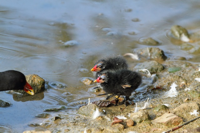 There's also yet another family of moorhens. This is the third brood this year, and the chicks are tiny. Tiny, but greedy 😉