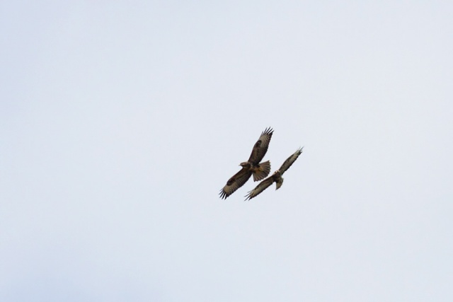 I kept an eye out for the buzzards, and sure enough they appeared on the brow of the hill. I had a little more time, so headed in their direction and was treated to a brief aerial display. The distance doesn't help, but I think (judging from the relative size) that there are two adults and a younger bird. I only managed to get two in shot together Buzzards