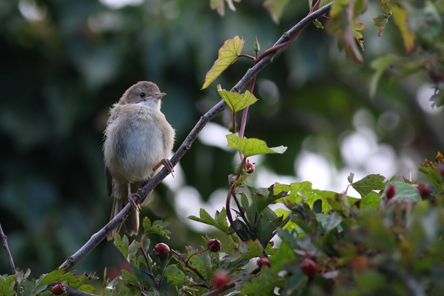 I went back to the same spot at lunchtime. The whitethroats were still around, and this time I was able to photograph the female with a young one. They were busy flitting back and forth, but every now and then settled the right side of all the branches and leaves.