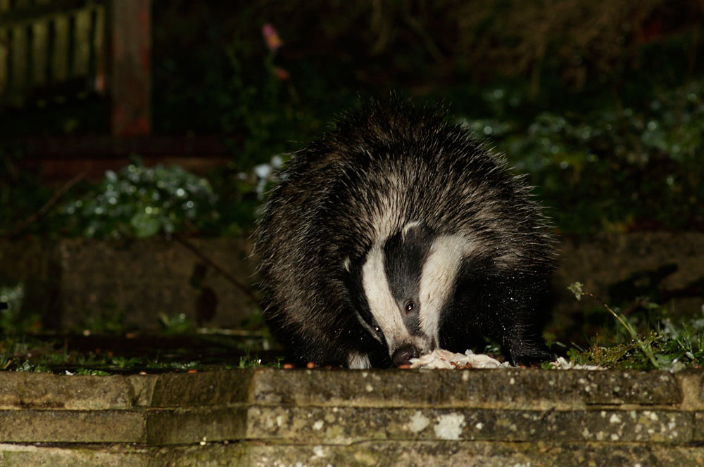 One of the badgers was back this evening and was clearly much more interested in the peanuts and scraps than whether a human was lurking nearby, camera in hand. Neither of us were bothered by the light drizzle.