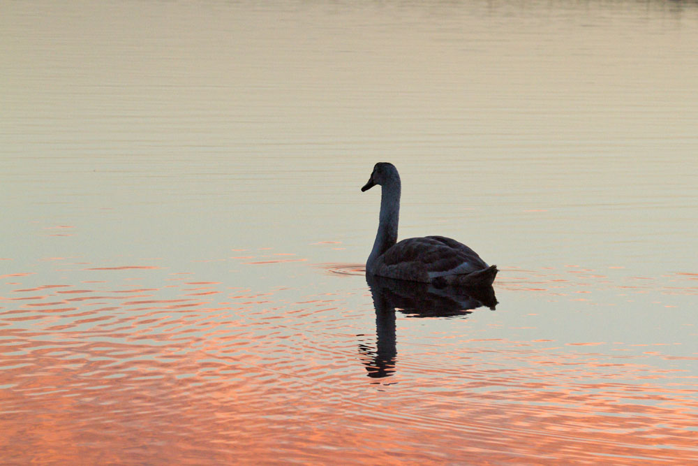 The swan was still there when I returned as the sun was setting at the end of the day, watched closely by a heron on the bank.