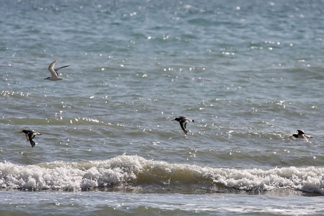 A small flock of oystercatchers were enjoying the sun, skimming along the water's edge. Oystercatchers