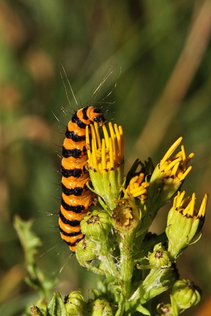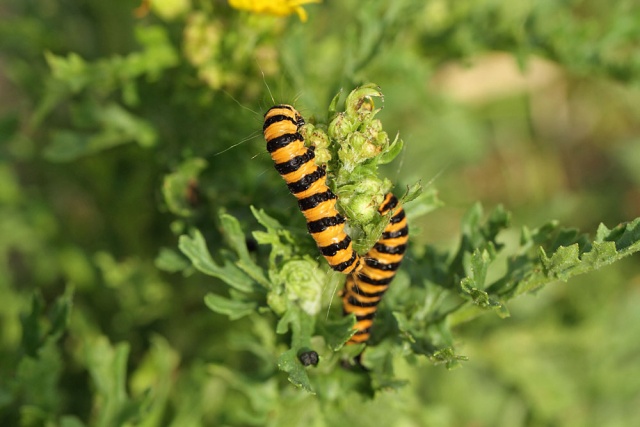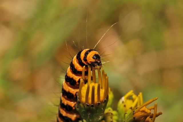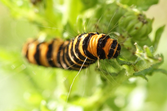 Another quiet day, so time to post those caterpillar photos I mentioned yesterday. The cinnabar caterpillar is very distinctive with bright orange and black stripes. It feeds almost exclusively on ragwort (they also like groundsel), and once on a plant will stay put until the food source runs out.
