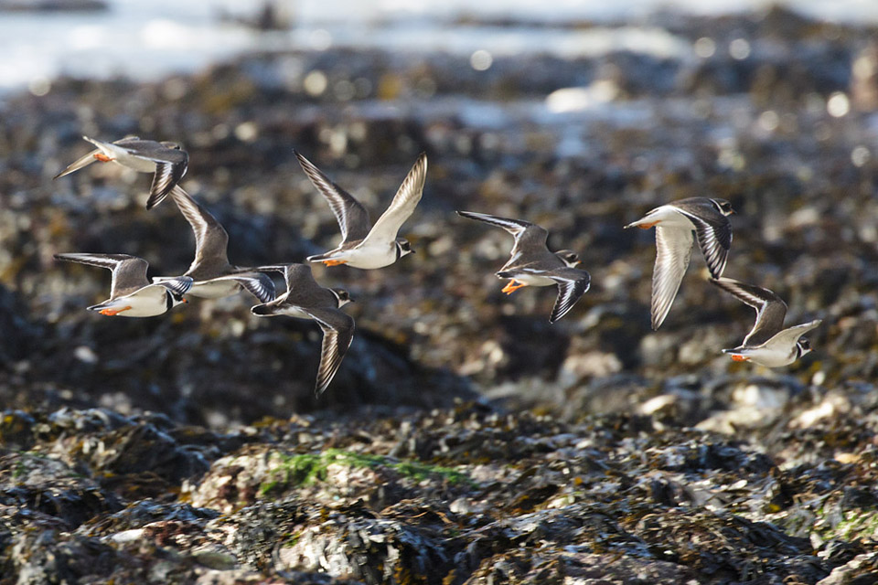 Much harder to spot than the pure white egret are the much smaller ringed plovers. When in among the rocks and pebbles they all but disappear from view (perfect camouflage), but even they can’t remain hidden from view once they take to the air.