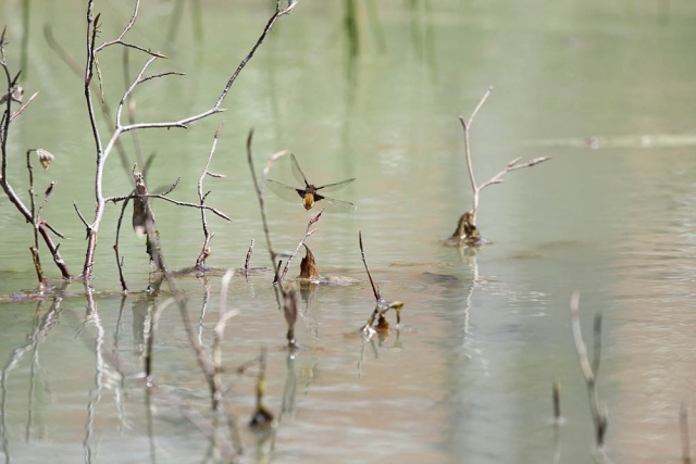 Far easier are the female broad bodied chasers. I got plenty of close-ups of her hovering and laying eggs, but occasionally it's worth showing a little more of the setting. Broad bodied chaser