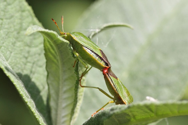 Meanwhile hidden among the elder at the rear of the garden, a pair of green shield bugs are mating.