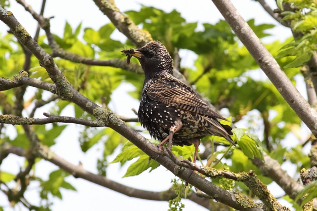 Up in the trees the greenfinches and starlings gather, the latter busy catching grubs to take back to their young.