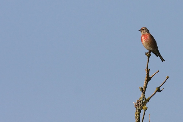 The heat wave continues, and now, pushing midnight, the temperature is still in the lower 70s (20s for those who prefer centigrade). Early morning is the best time of day to be out. It's still relatively cool then, and is certainly favoured by the woodland birds. Such as this cock linnet, which was happily surveying the passing insect life.