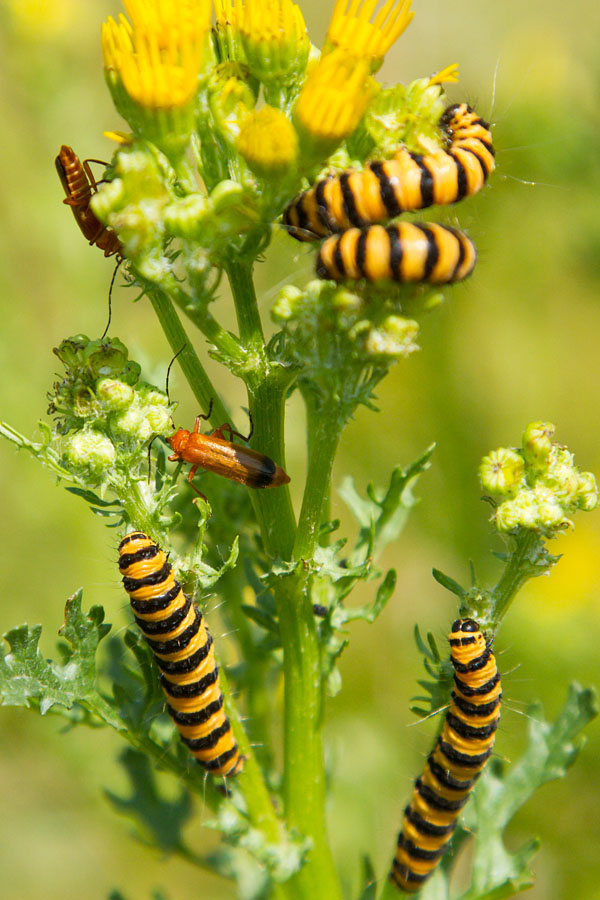 The other very common species is the cinnabar. Actually a moth, and in this case in the caterpillar stage. They were very easy to spot on the forest of ragwort in the fields beyond the campus fringe.