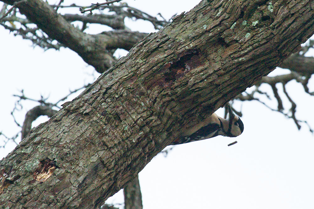 At lunchtime things hadn’t changed much, and it was raining 🙁 Just one shot, a great spotted woodpecker on the churchyard tree, busy tapping away and sending shards of wood flying out.