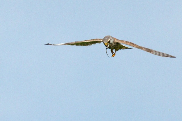 The third shot is an unhealthy crop, but I've included it as it shows the kestrel devouring what I think is a common lizard while maintaining a perfect flight pattern.