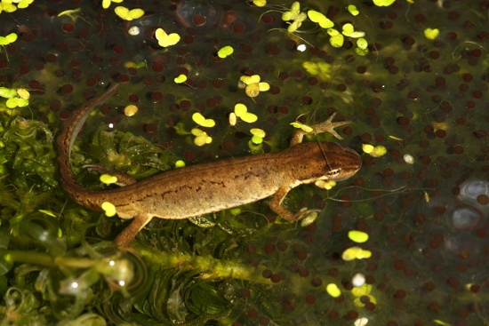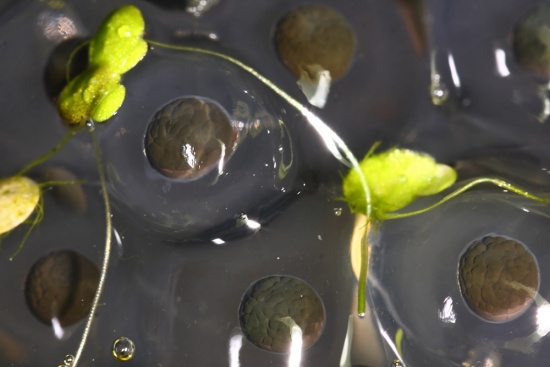 We have a very healthy crop of spawn this year (much better than last year), which may be just as well since the predators are already on the prowl. Newt prowling over frog spawn
