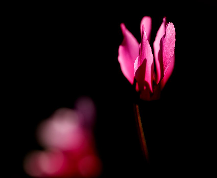 The final shot for the moment is another plant that has ‘taken over’ – a very pretty cyclamen coum. And as with the first photo I’ve made use of the strong light and under-exposed to get the dark background.