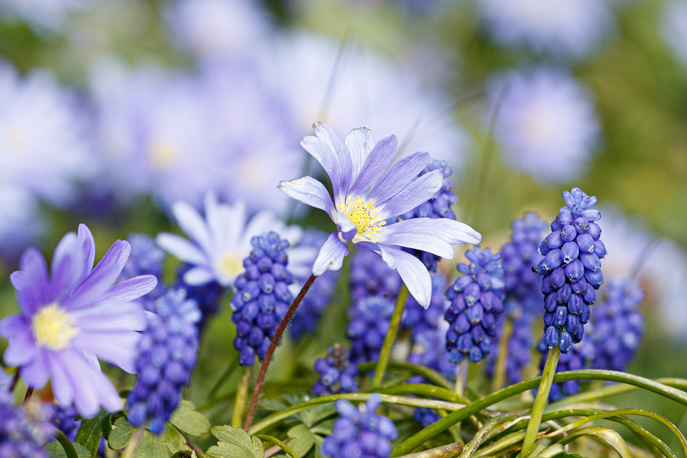 These have also seeded themselves. The grape hyacinth is dying back now, but was everywhere in late March. Same with the anenomes, which have now faded.