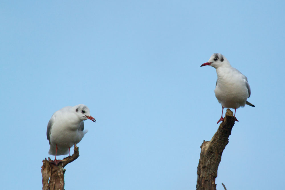 The cormorant was back, once again taking to the trees but I’ll skip those images today as lunchtime brought with it a rather special treat. Not these cute black-headed gulls posing on parallel tree stumps… (but I like the photo so I’m including it)