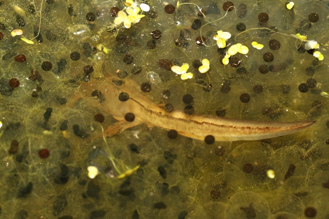 UK readers will know the traditional saying ("pissed as a newt", as in "drunk"), but having witnessed the current activity in our pond I'm inclined to think of newts as greedy rather than drunken. Witness this one embedding itself in the mass of developing spawn.