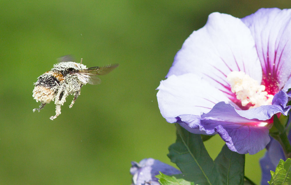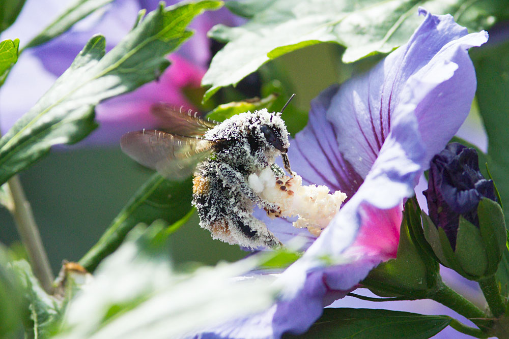 We’re fortunate to have plenty of bees in the garden. They have a particular taste for the hibiscus bush, so much so that it is a small wonder they can even fly.