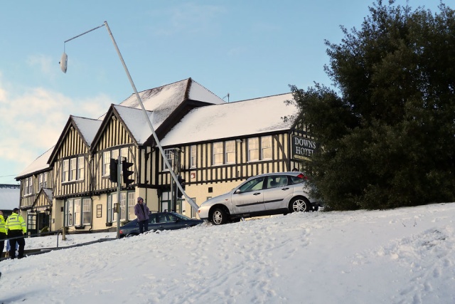 19 Dec 2010Adele, I can never understand why people get in their cars when it's like this. The lamp post is at the bottom of a fairly steep hill (just before a junction, which descends even more rapidly on the other side. Crazy even to attempt it. Without the 'obstacle' it's a good 2 miles before you reach level ground!