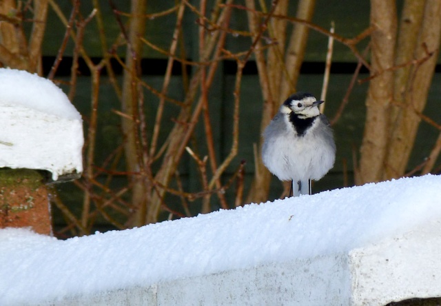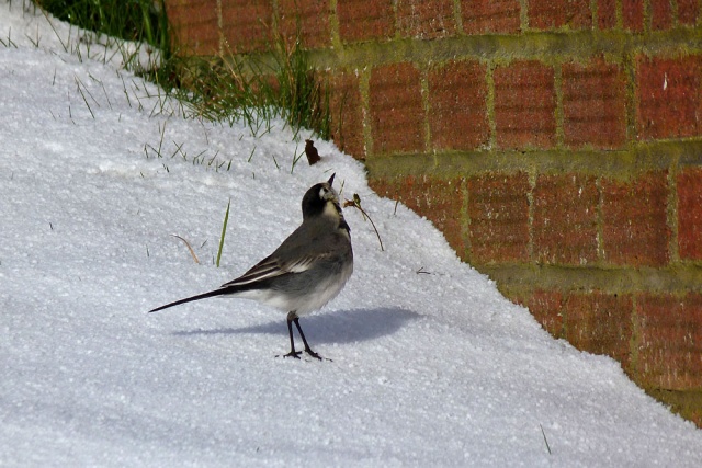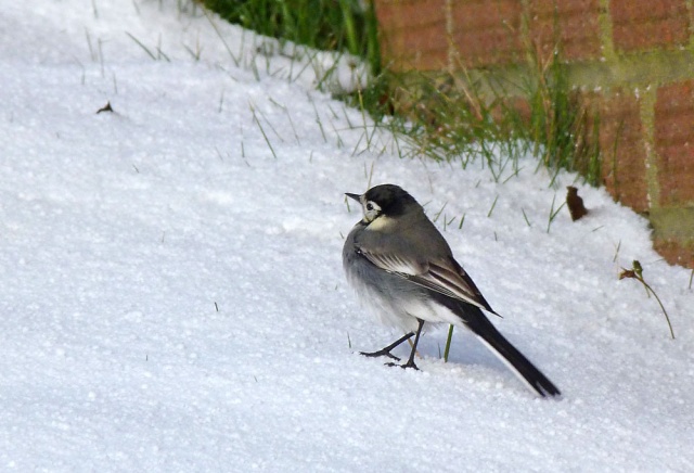 It was on my way back (with plenty of supplies) that I had my wildlife encounter. Nothing exotic, but small birds in snow are always fun to see, especially when they are as lively as this little pied wagtail.