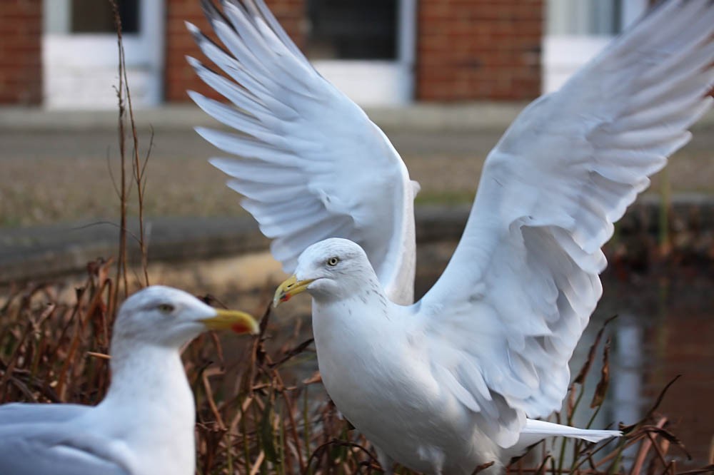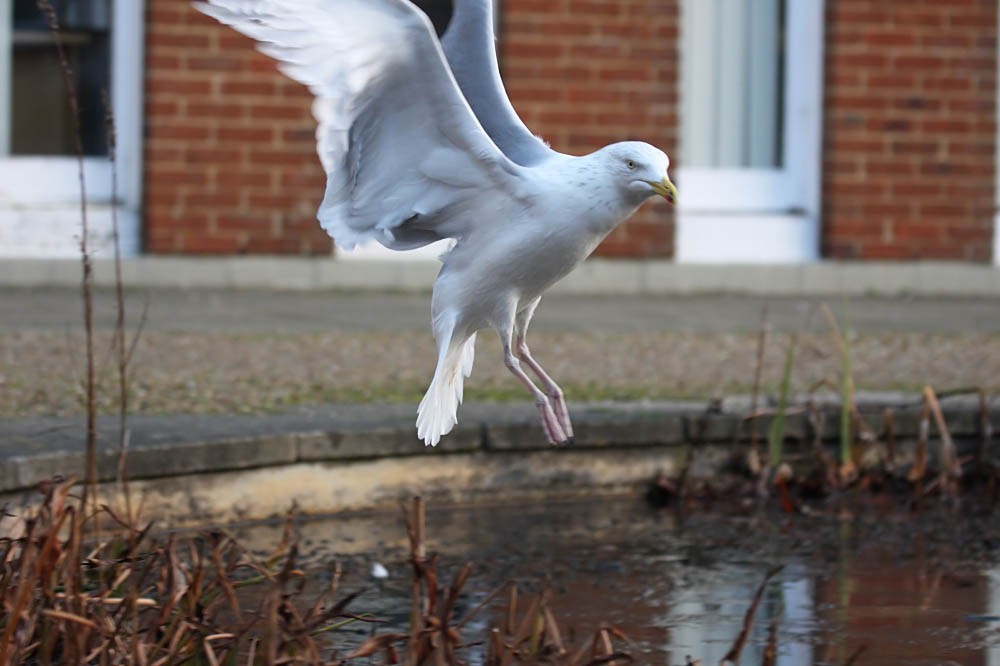 I took these during a severely truncated lunchbreak today. The pond is a small ornamental feature a few yards from my office, and occasionally the gulls make use of it.