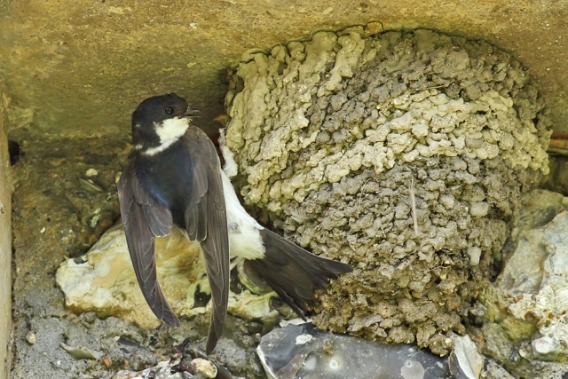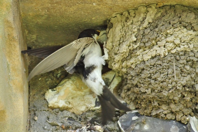 And now to the main part of the post. I've been photographing the local swallows and house martins on a regular basis over the past few weeks, and today I spotted the very distinctive nest of a house martin, clamped to the eaves of the local church.