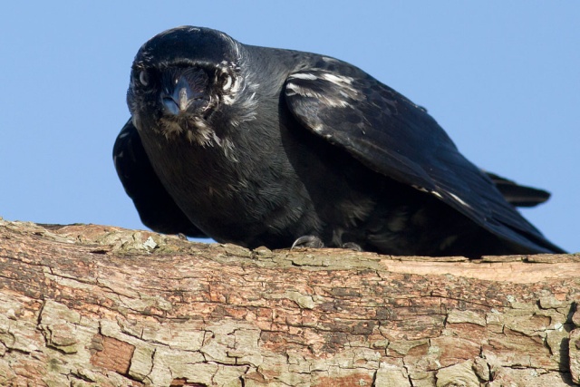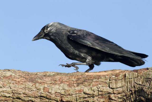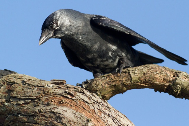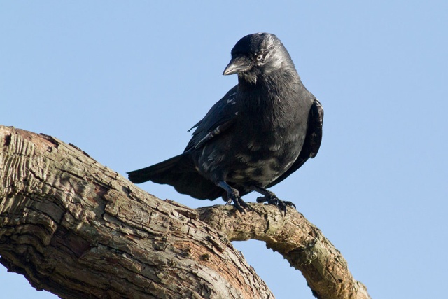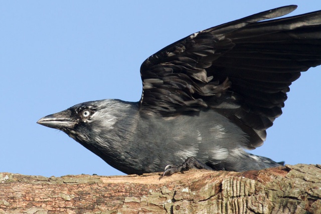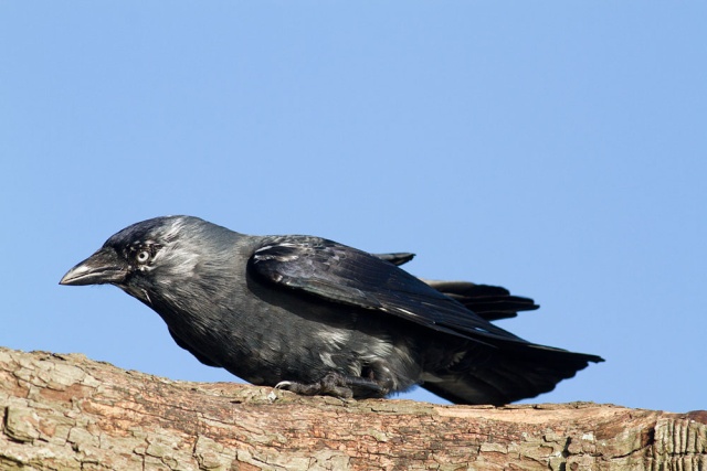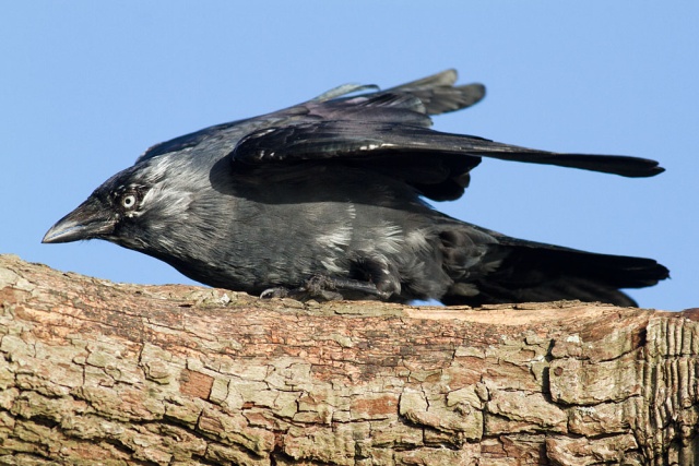 These shots were taken in a fierce wind at lunchtime today. The jackdaw had settled on a tree by the side of the local pond, and spent much of the time crouching low while facing into the wind. Birds do seem to know something about airflow ;). . I was just a few feet away trying to stay upright.