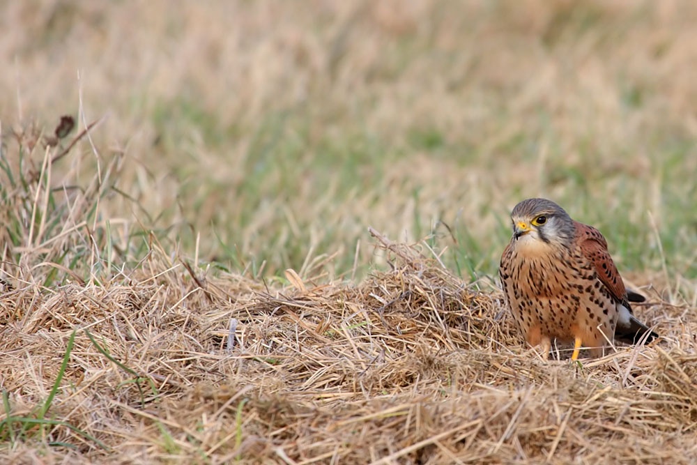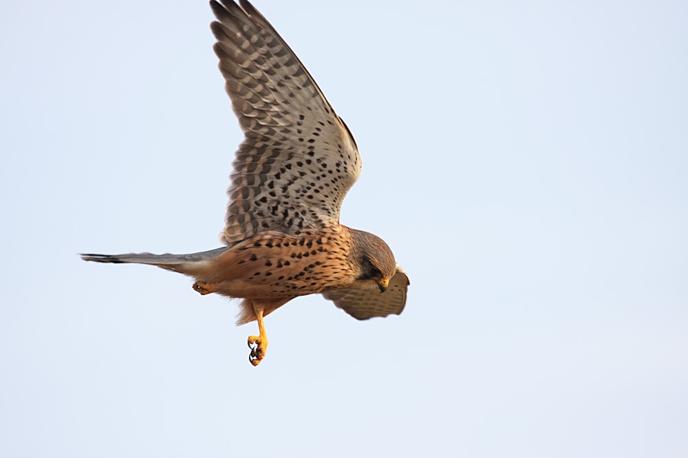 I tracked her for while until she disappeared over the hill. Next up was a male kestrel which I saw swoop down into the grass. He attracted a small crowd of watchers while he devoured his prey (a worm).